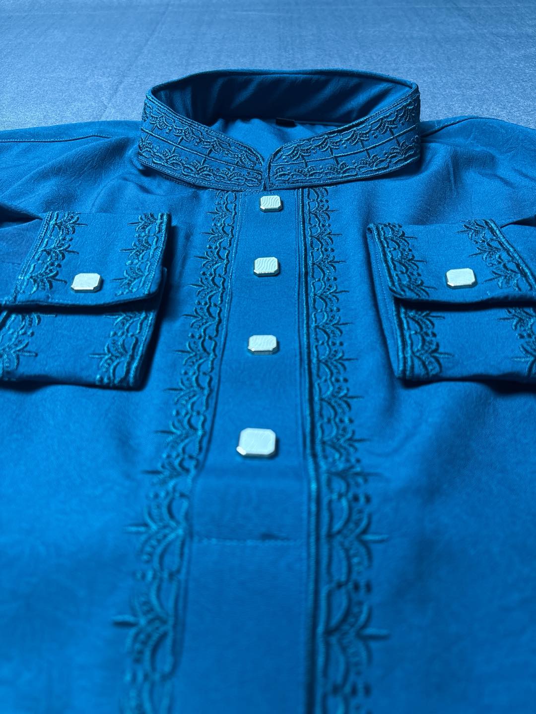 ✨Elegant Teal Blue China Vangchur Stice Fabric Panjabi✨